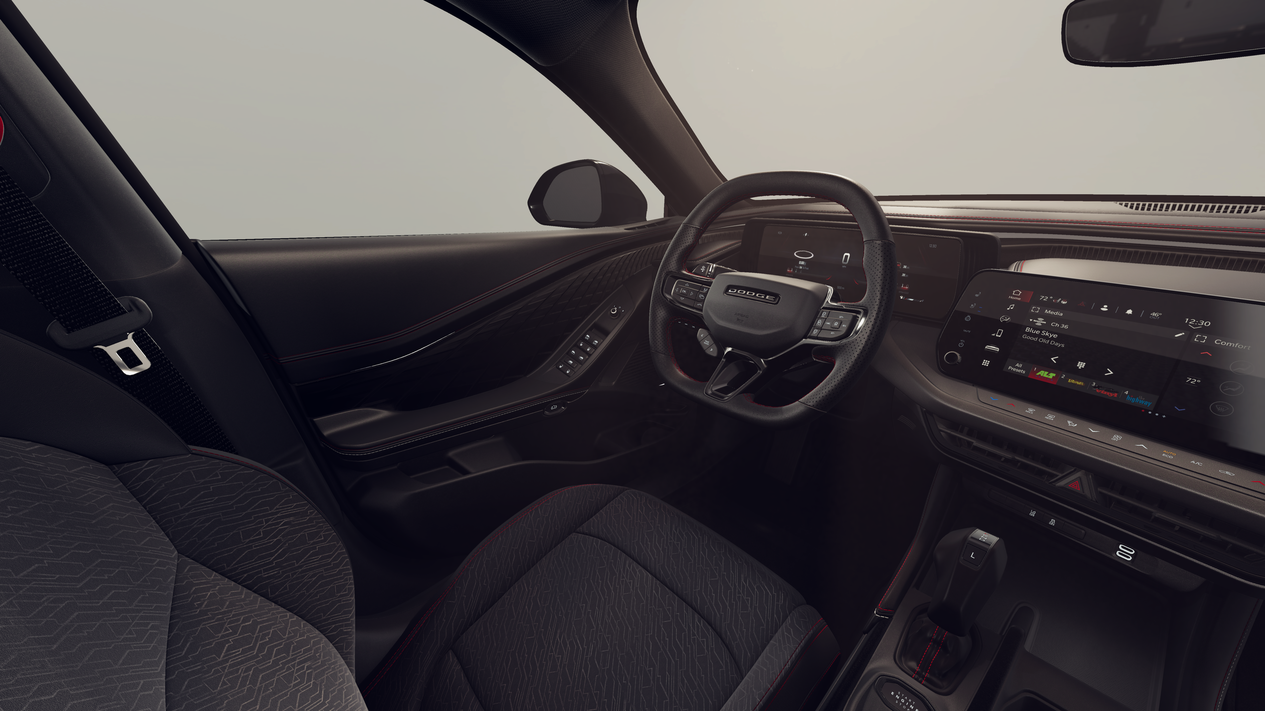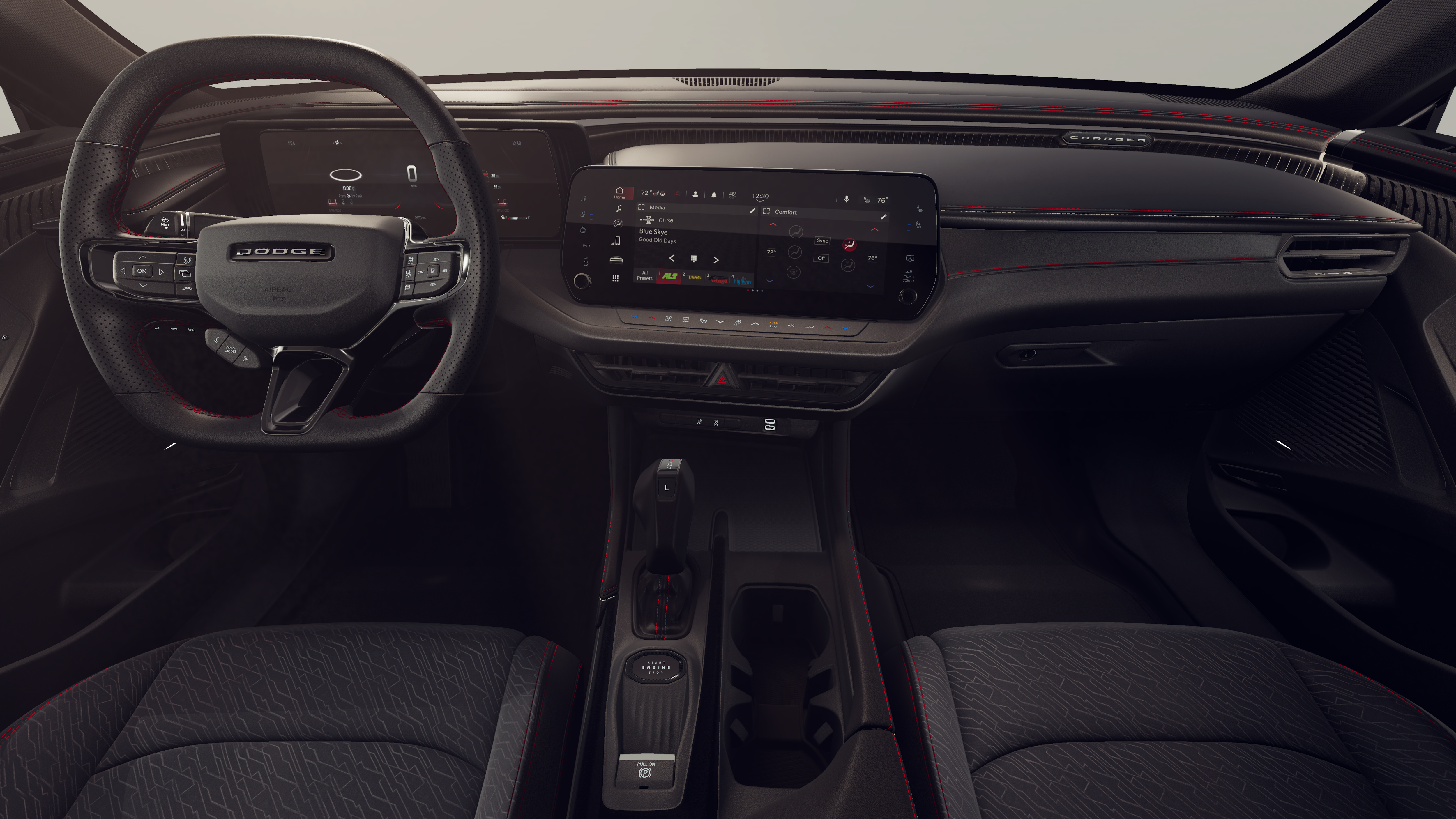 This 2026 Dodge Charger R/T Scat Pack comes nicely equipped with the following Blacktop Package (Dark Exterior Badging, Dual Rear Exhaust with Black Tips, and Wheels: 20 x 10 Dark Finish Aluminum), Quick Order Package 22P Scat Pack, Two Tone Paint Group, 10 Speakers, 2-Way Manual Adjust Front Head Restraints, 2-Way Power Driver Lumbar Adjust, 4-Wheel Disc Brakes, 4G LTE Wi-Fi Hot Spot, 8-Way Power Driver Seat Adjust, ABS brakes, Active Noise Control System, Air Conditioning, Alloy wheels, AM/FM radio: SiriusXM w/360L, Apple CarPlay/Android Auto, Auto-dimming Rear-View mirror, Automatic temperature control, Brake assist, Bumpers: body-color, Compass, Connectivity - US/Canada, Delay-off headlights, Disassociated Touchscreen Display, Driver door bin, Driver vanity mirror, Dual front impact airbags, Dual front side impact airbags, Electronic Stability Control, Emergency communication system: Dodge Connect, Four wheel independent suspension, Front anti-roll bar, Front Bucket Seats, Front Center Armrest, Front dual zone A/C, Front reading lights, Fully automatic headlights, Garage door transmitter, Heated door mirrors, Heated Exterior Mirrors, Heated Front Seats, Heated front seats, Heated steering wheel, Illuminated entry, Integrated Center Stack Radio, Knee airbag, Leather Shift Knob, Leatherette/Cloth Performance Seats, Low Back Bucket Seats, Low tire pressure warning, Manufacturer's Statement of Origin, Occupant sensing airbag, Outside temperature display, Overhead airbag, Overhead console, Panic alarm, ParkView Rear Back-Up Camera, Passenger door bin, Passenger vanity mirror, Power Adjust Mirrors, Power door mirrors, Power driver seat, Power steering, Power windows, Radio data system, Radio: Uconnect 5 with 12.3 Display, Rear anti-roll bar, Rear reading lights, Rear seat center armrest, Rear window defroster, Remote keyless entry, Security system, Speed control, Split folding rear seat, Spoiler, Sport steering wheel, Steering wheel mounted audio controls, Tachometer, Telescoping steering wheel, Tilt steering wheel, Traction control, Trip computer, Variably intermittent wipers, Wheels: 20 x 10 Aluminum, Wireless Apple CarPlay, and Wireless Google Android Auto.