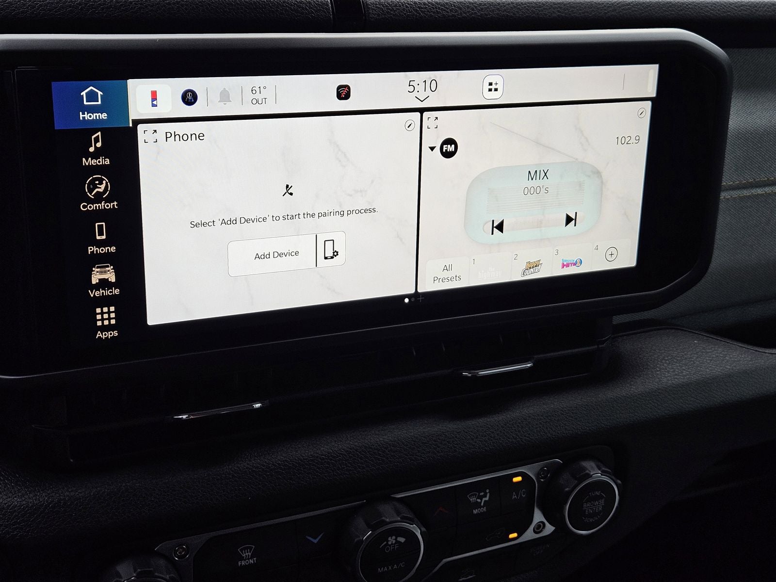 Inside, the cabin balances durability with modern connectivity. The Uconnect 5 system features a large 12.3-inch touchscreen with Apple CarPlay and Android Auto, keeping navigation, communication, and entertainment easily accessible. Practical interior touches such as easy-access seating, assist handles, and multiple power outlets support both daily driving and weekend adventures.