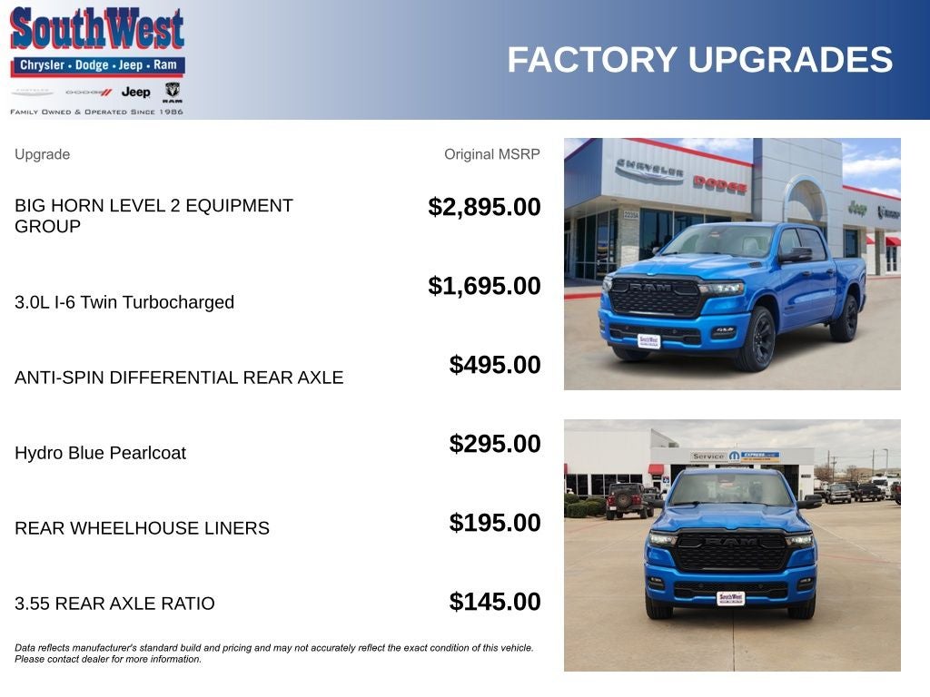 Whether you're hauling a heavy load, embarking on an off-road adventure, or simply commuting in style, the 2026 Ram 1500 Big Horn/Lone Star is the perfect companion. Experience the perfect blend of power, capability, and comfort. Visit our showroom today and let us demonstrate why this truck should be your next ride. Price includes: $1000 - 2026 Southwest BC State of Texas Regional Bonus Cash . Exp. 04/30/2026 $3500 - 2026 National Retail Bonus Cash . Exp. 04/30/2026 $750 - 2026 Southwest BC Retail Bonus Cash . Exp. 04/30/2026
