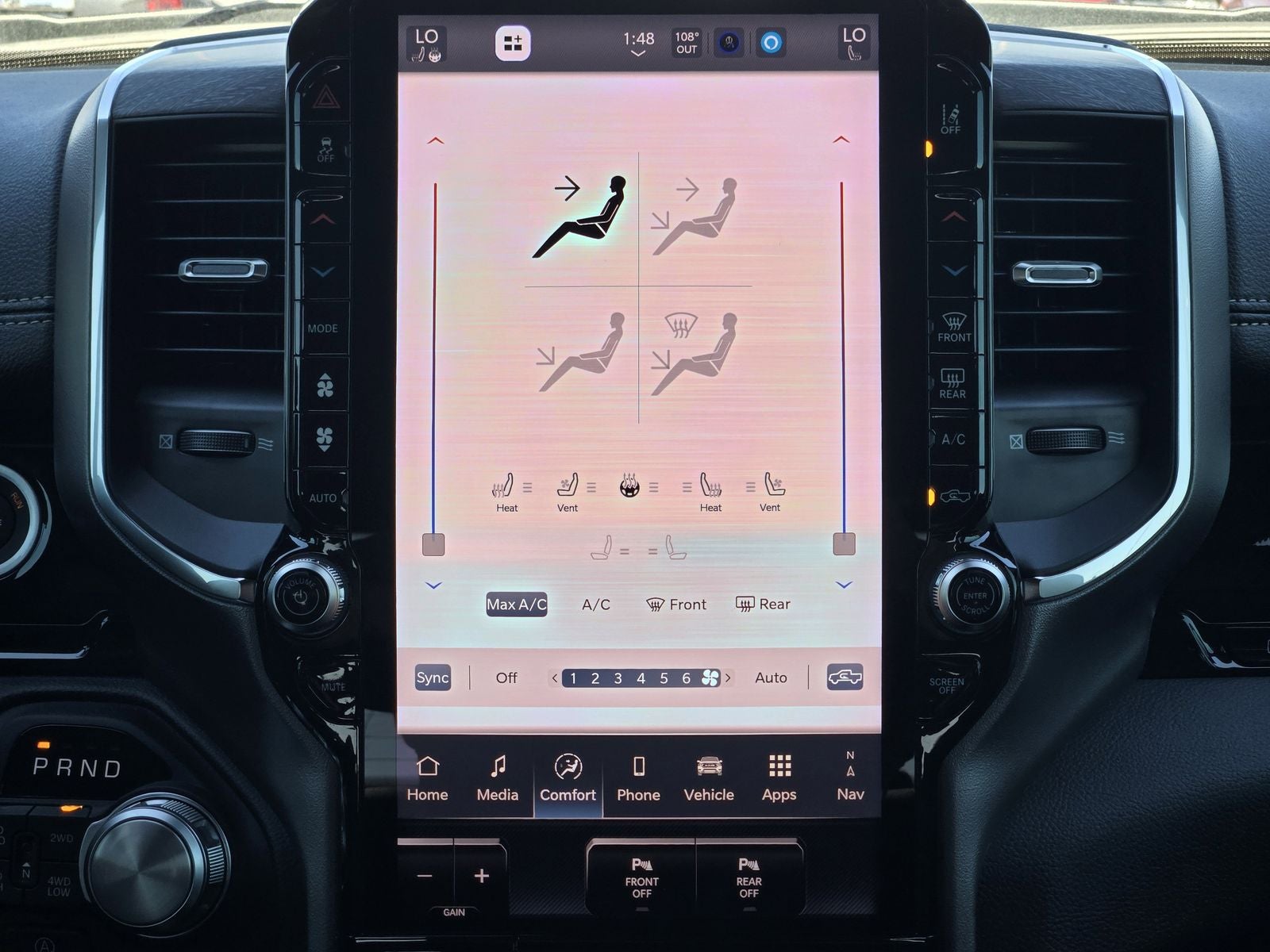 Inside, the Laramie's leather-trimmed bucket seating and memory-equipped power adjustments create a cabin that feels both upscale and functional. Heated and ventilated front seats, heated second-row seating, and a leather-wrapped heated steering wheel ensure year-round comfort, while Rams thoughtful interior layout keeps controls intuitive and storage practical.