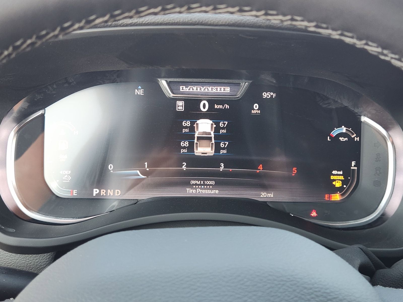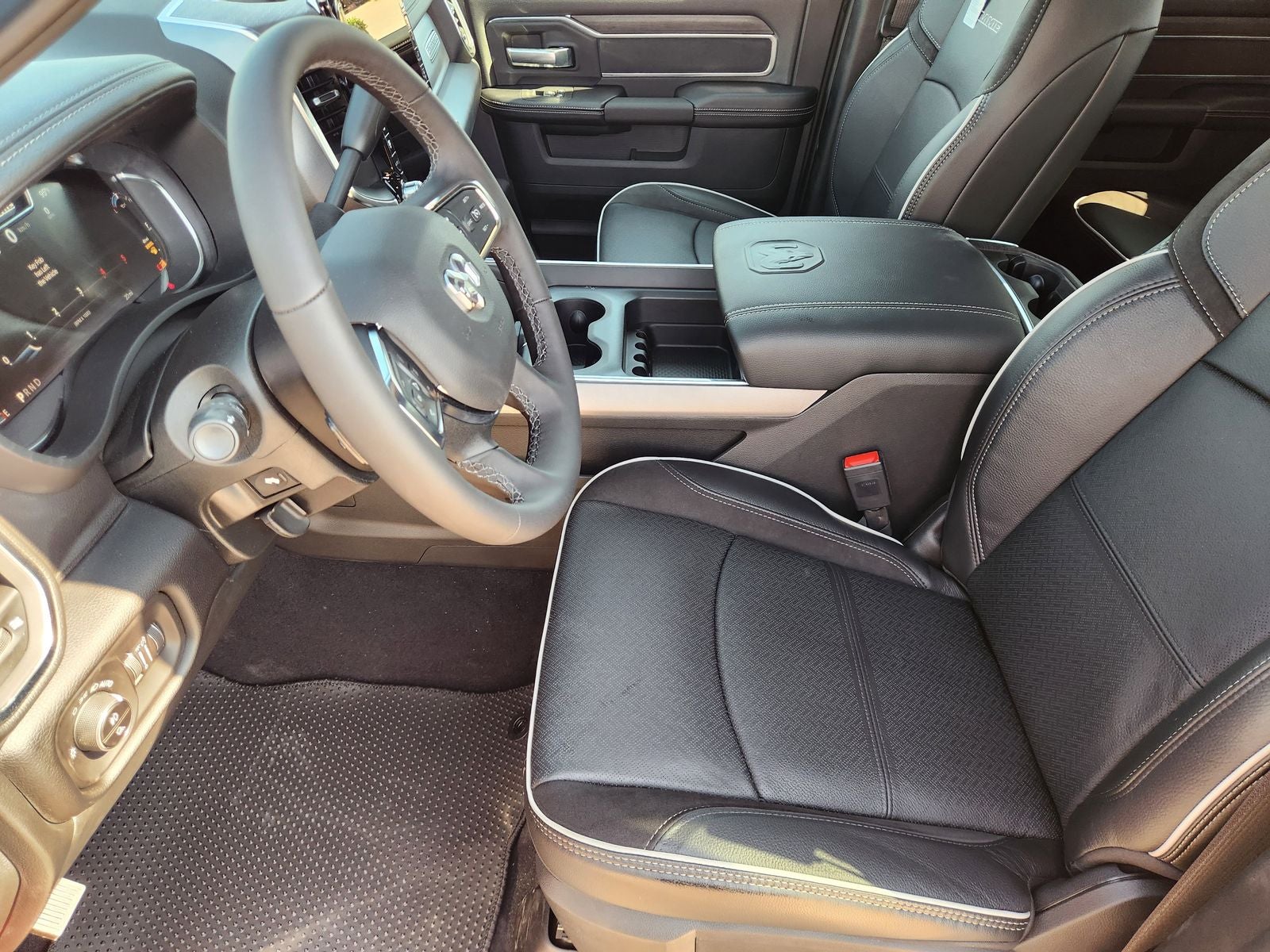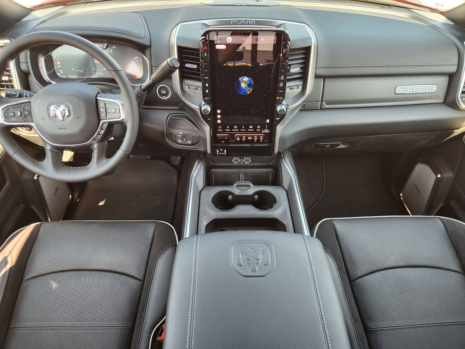 Beyond its impressive powertrain, this Laramie trim level pampers you with a wealth of premium features. The spacious cabin is outfitted with luxurious leather-trimmed bucket seats, a heated steering wheel, and a stunning 14.4 Uconnect 5 touchscreen display with navigation. Connectivity is seamless, thanks to Apple CarPlay, Android Auto, and a 4G LTE Wi-Fi hotspot.