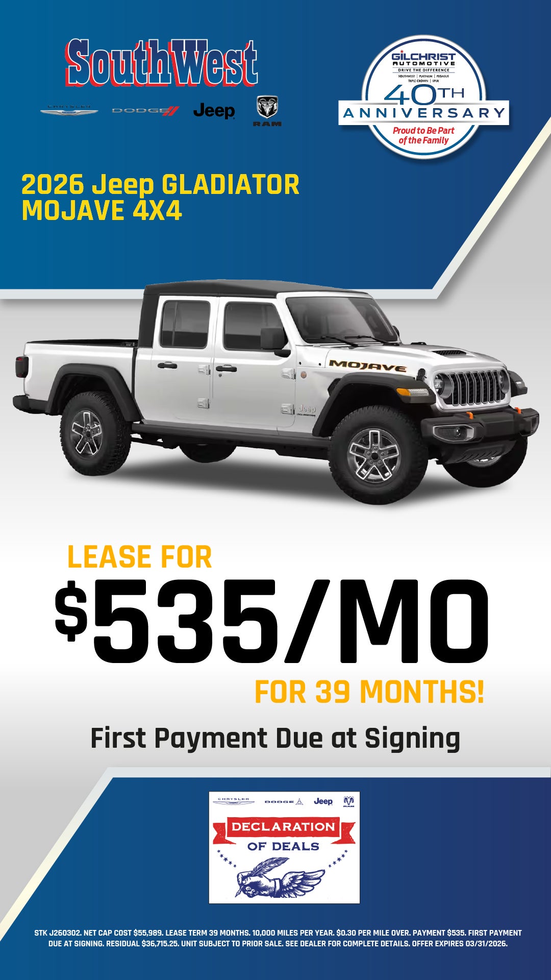 Stk J260302. Net cap cost $55,989. Lease term 39 months. 10,000 miles per year. $0.30 per mile over. Payment $535. First payment due at signing. Residual $36,715.25. Unit subject to prior sale. See dealer for complete details. Offer expires 03/31/2026.